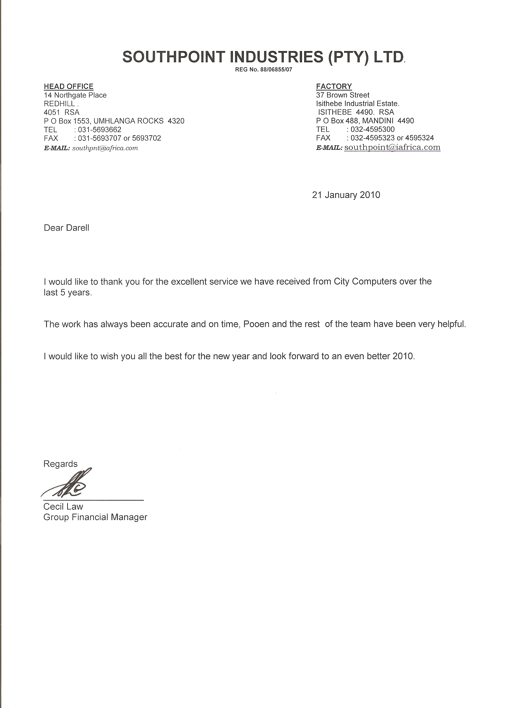 I would like to thank you for the excellent service we have received from City Computers over the last 5 years. The work has ... read more > Cecil Law - Group Financial Manager - Southpoint |